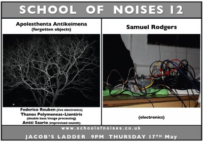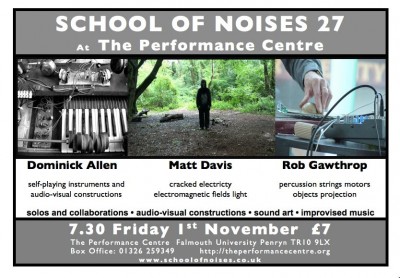 The School of Noises, a collective of locally based artists and musicians (Falmouth-Penryn-Truro-Redruth) ran a programme of performances and events from 2011 to 2013 of experimental music, noise and sound art (improv., DIY, compositions, glitch, environmental etc.). The programme included members of the collective and invited guests.